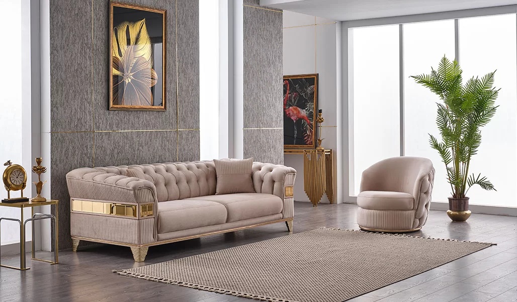 Luksusa dizainera mēbeļu komplekts 2 gabali – dīvāns ar trim un vienu sēdvietu, ir ideāls risinājums, lai radītu elegantu un izsmalcinātu viesistabas atmosfēru. Izgatavots no augstas kvalitātes bežā poliestera, šis komplekts apvieno komfortu un stilu, nodrošinot nepārspējamu sēdvietu pieredzi. Tās smalkās līnijas un izsmalcinātais dizains atspoguļo ekskluzīvu dzīvesveidu, kas ir raksturīgs mūsu 20 gadu ilgajai pieredzei luksusa mēbeļu jomā. Šis komplekts kļūs par jūsu mājas centrālo elementu, piedāvājot ne tikai estētiku, bet arī ilgmūžību un praktiskumu. Ieguldiet savā telpā un paceliet to jaunā, izsmalcinātā līmenī.