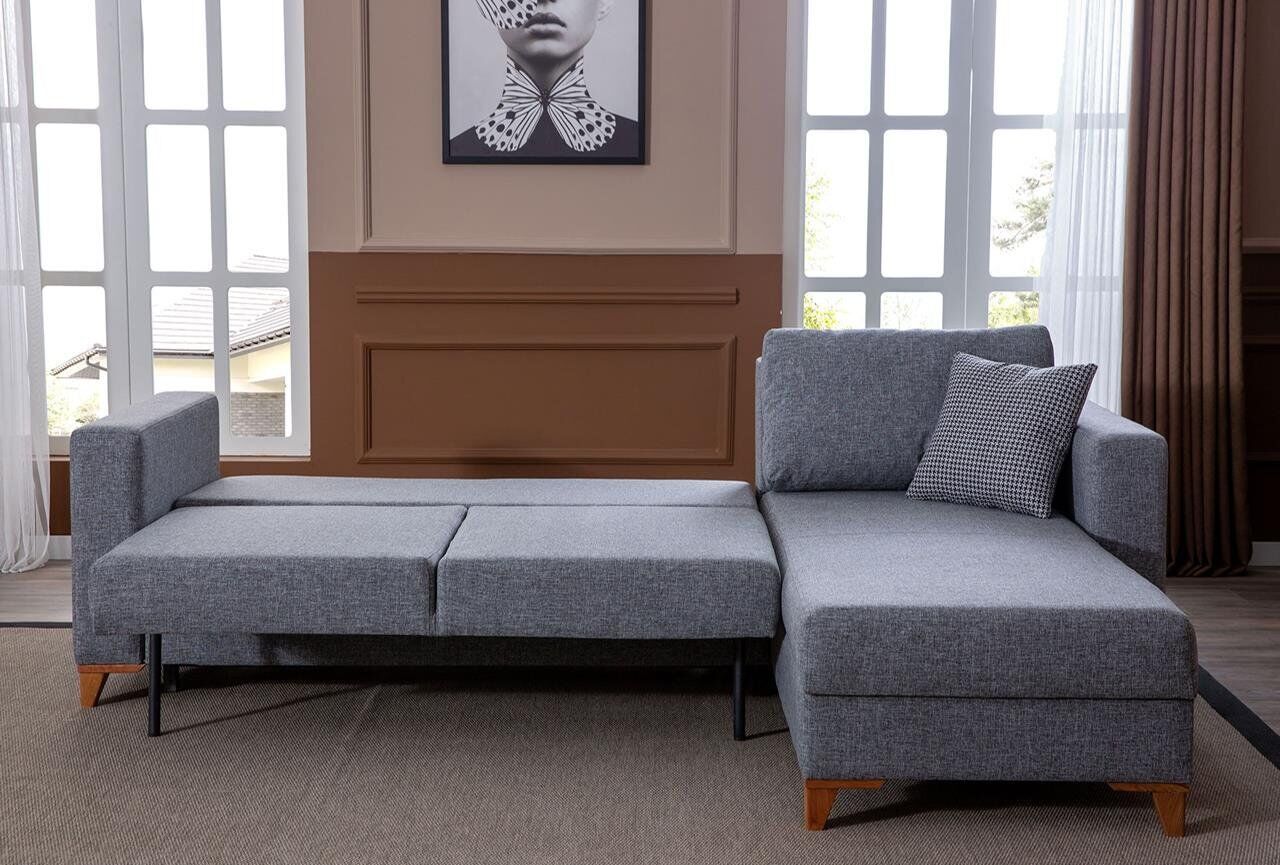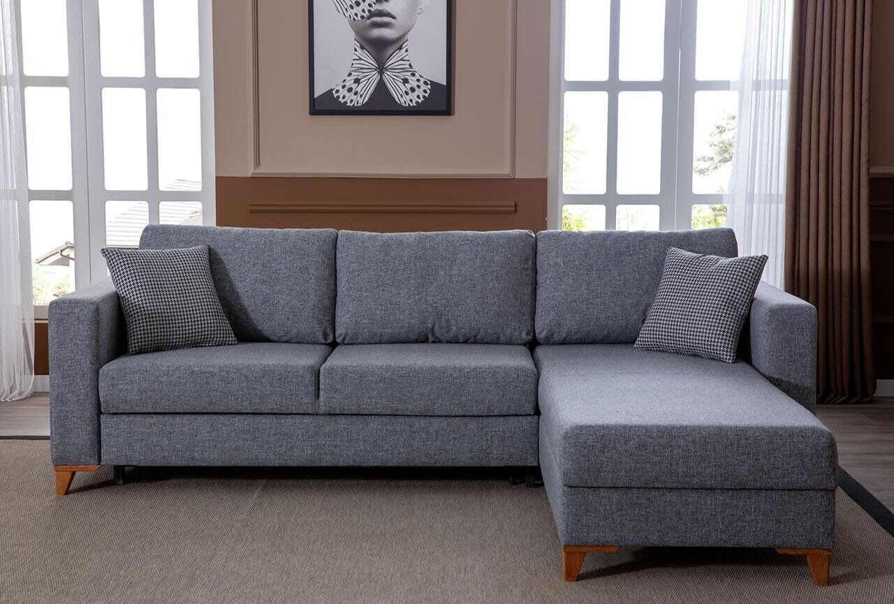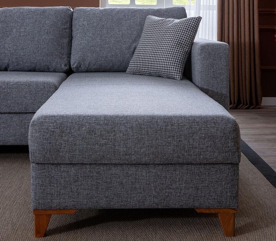 Stilīgais pelēkais polsterētais dīvāna dizainera stūra dīvāns ir lielisks papildinājums jebkurai dzīvojamās istabas interjeram. Ar tā izmēriem apmēram 245 x 170 cm vai 170 x 245 cm un augstumu apmēram 85 cm, šis dīvāns ir ērts un pievilcīgs sēdošanas variants. Elegantā pelēkā krāsā un augstas kvalitātes koka un tekstila materiālā, tas nodrošina gan stilu, gan ērtību.