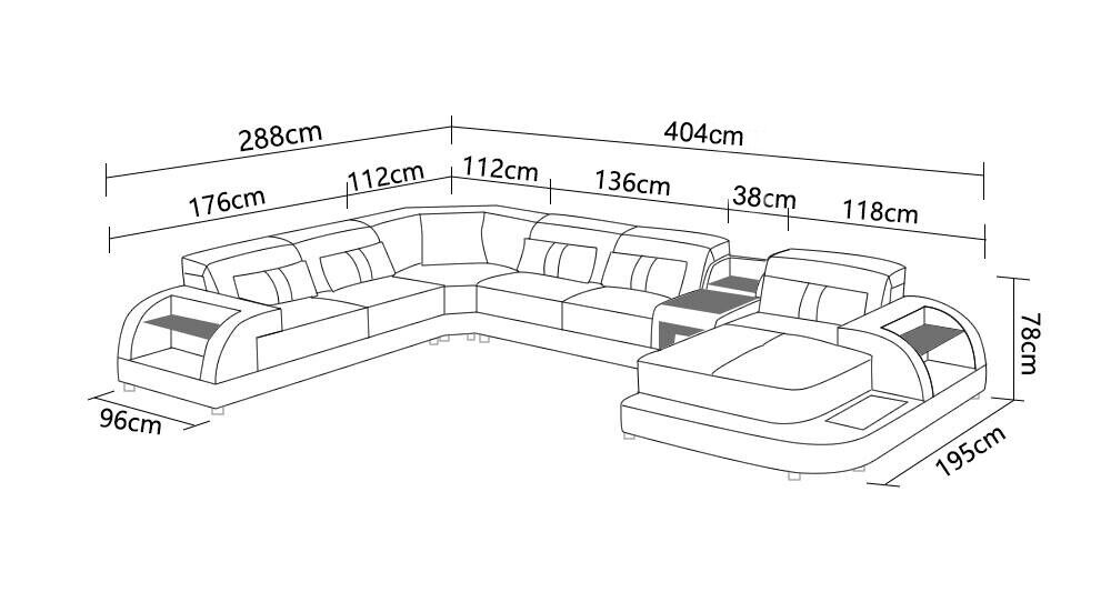 Šis U formā stūra dīvāns ir ideāls iekārta jūsu dzīvojamā istabai, nodrošinot gan komfortu, gan eleganci savā dizainā. Ar izmēriem apm. 288 x 404 x 195 cm vai 195 x 404 x 288 cm, šis divvietīgais mīkstais dīvāns piedāvā plašu sēdēšanas zonu, kur varēsiet relaksēties un baudīt brīžus ar ģimeni vai draugiem. Izmantotais materiāls - Premium ādas šķiedru audums (70% ādas / 30% poliestera), nodrošina gan augstu kvalitāti, gan ilgmūžīgu izturību. Augstums apm. 78 cm sagādās ērtības, savukārt dažādās krāsas iespējas ļaus jums izvēlēties atbilstoši savam interjeram.