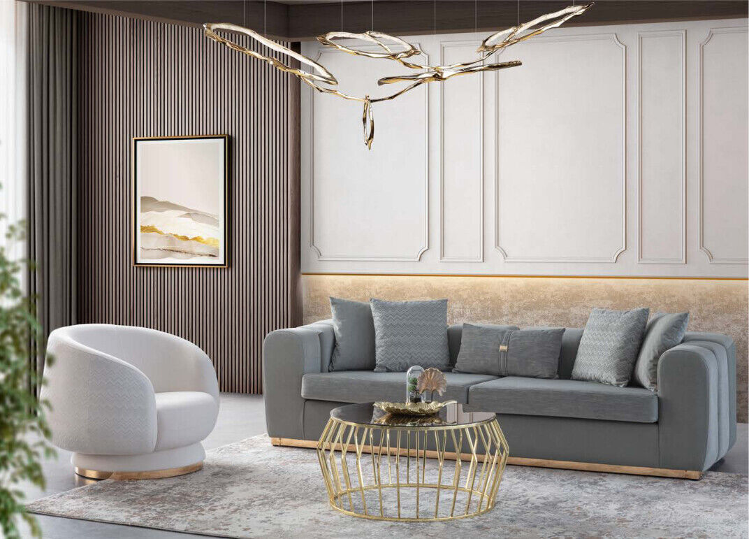 Pilka-balta dzīvojamā istaba Sēdvietu komplekts Ar luksusa polsterētām dīvāngultām 4-vietīgs krēsla ir ne tikai elegants, bet arī ērts papildinājums jebkurai mūsdienu dzīvojamai istabai. Šis komplekts iekļauj 4-vietīgu dīvānu un divus krēslus, kas ir izgatavoti no izturīgiem materiāliem un polsterējumiem. Dīvāna un krēslu augstvērtīgās polsterējumu garantē maksimālu komfortu, kamēr koksnes detaļas piešķir komplektam eleganci un ilgmūžību. Šis komplekts ne tikai papildinās jūsu mājas interjeru, bet arī nodrošinās ērtu un stilīgu atpūtu visām Jūsu ģimenes locekļiem un viesiem.