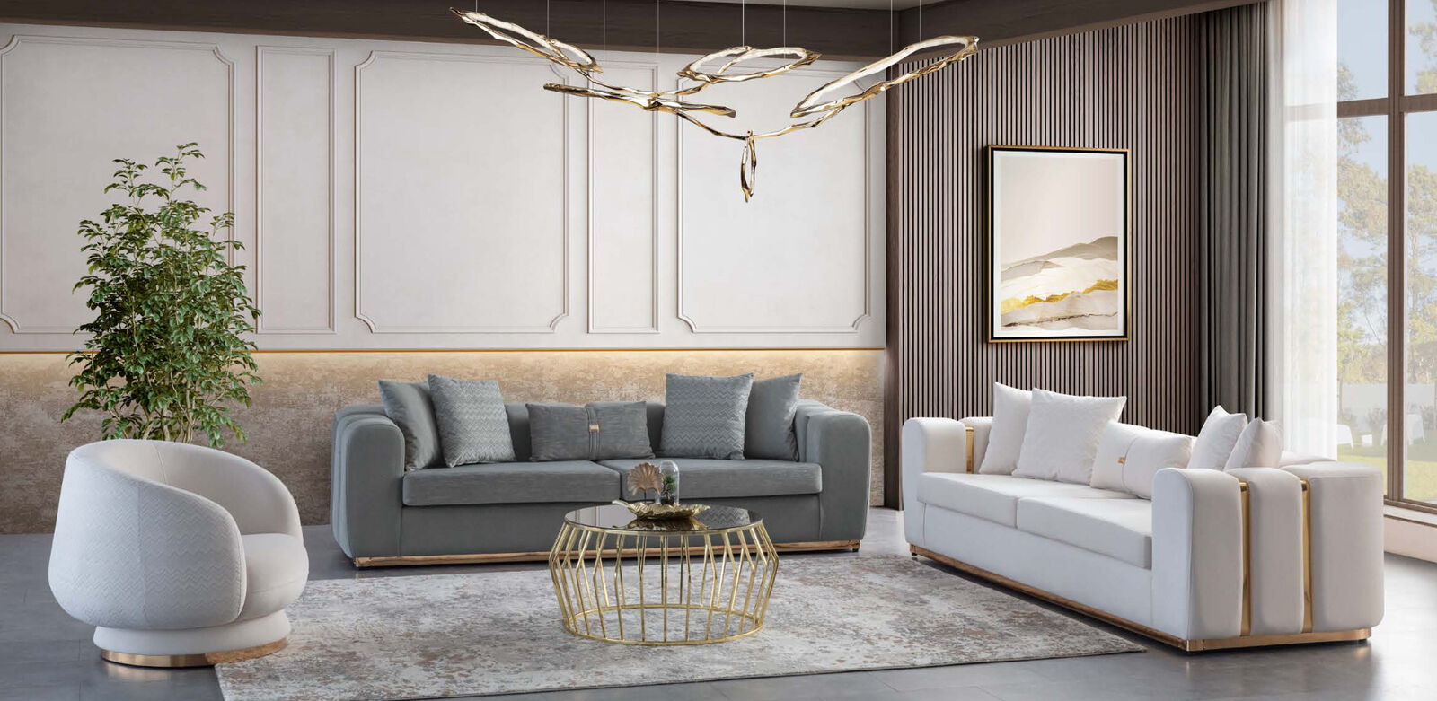 Pelēka un baltā krāsā gultas komplekts dzīvojamā istabā četrpersonu gulta luksusa krēsls 2 gabalos: Šis gultas komplekts un krēsls ir perfekta izvēle tiem, kas vēlas piešķirt savai dzīvojamajai istabai elegantu un stilīgu izskatu. Ar 4-vietīgo dīvānu un komfortablu krēslu, šis komplekts nodrošina gan ērtību, gan luksusa sajūtu. Augstas kvalitātes koks un tekstilija nodrošina izturību un ilgmūžību, tādējādi nodrošinot, ka šis komplekts kalpos jums ilgu laiku ar nesamazinātu stila un komforta līmeni.