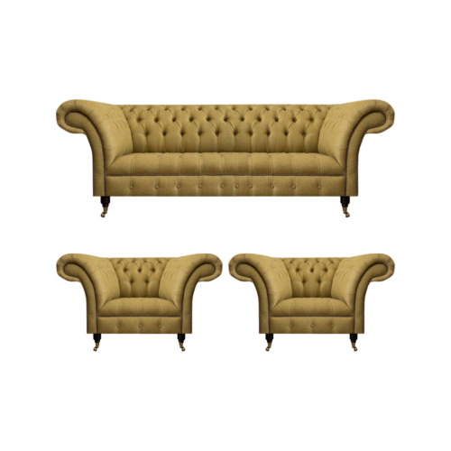 Papildus "Chesterfield" dīvānam, šis komplekts ietver arī divus stilīgus krēslus un plašu 3-vietīgo gultu, kas ideāli iederēsies jebkurā dzīvojamā istabā vai viesnīcā. Krēsli un gulta ir izgatavoti no augstas kvalitātes koka un tekstila materiāliem, nodrošinot gan izturību, gan komfortu. Atliek vien izvēlēties, vai izvēlēties vienošanās un glaimojošas Swarovski kristāliņus, lai piešķirtu vēl vairāk elegances un greznības šim jau tā lieliskajam komplektam.