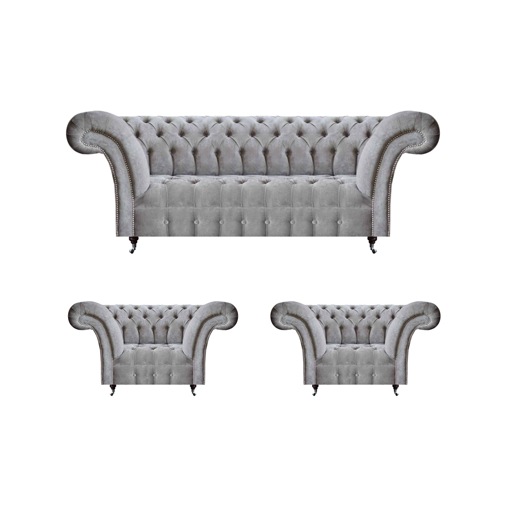 Pelēka 3 daļu mīkstās mēbeles komplekts - 2 krēsli un divvietīgā dīvāna Chesterfield stils
