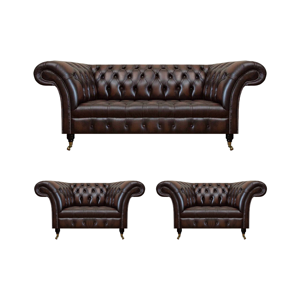 Luksusa brūna ādas dīvāns ar 2 krēsliem un trīs vietīgu dīvānu, Chesterfield stila, dzīvojamā istaba