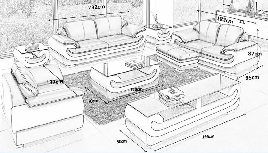 Sofagarnitura 3-vietīgs dzīvojamo platību iekārtojums Moderns dīvāns ādas dīvāns dizaineris ir izsmalcināta un moderna dīvāna komplekts, kas būs lielisks papildinājums jebkuram mūsdienīgam dzīvojamam telpas interjeram. Šis 3-vietīgais dīvāns ir izgatavots no premium ādas šķiedru auduma (70% āda / 30% poliesters), nodrošinot augstu kvalitāti un ilgmūžību. Ar izmēriem apmēram 232 x 95 x 87 cm, 182 x 95 x 87 cm un 137 x 95 x 87 cm, dīvāns piedāvā gan plašas sēdvietas, gan stilīgu dizainu, kas pieskaņosies jebkuram telpas iekārtojumam.