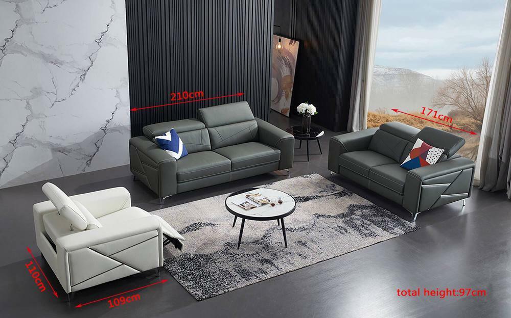 Šis modernais dīvāns sastāv no 3 daļīga 3 sēdvietīga dīvāna, 2 sēdvietīga dīvāna un 1 sēdvietas dīvāna, kur katrai daļai ir precīzi aprēķinātas dimensijas - no garuma un platuma līdz sēdēšanas dziļumam un augstumam. Izkraujošā krāsu izvēle un iespējams materiālu grupējums sniedz jums plašas iespējas pielāgot šo komplektu saskaņā ar jūsu personīgajām vēlmēm un interjeru. Lai nodrošinātu gan izsmalcinātu izskatu, gan komfortablu sēdēšanu, šis mēbeļu komplekts ir izvēlēta izcila izvēle mūsdienīgam un luksus dzīvesveidam.