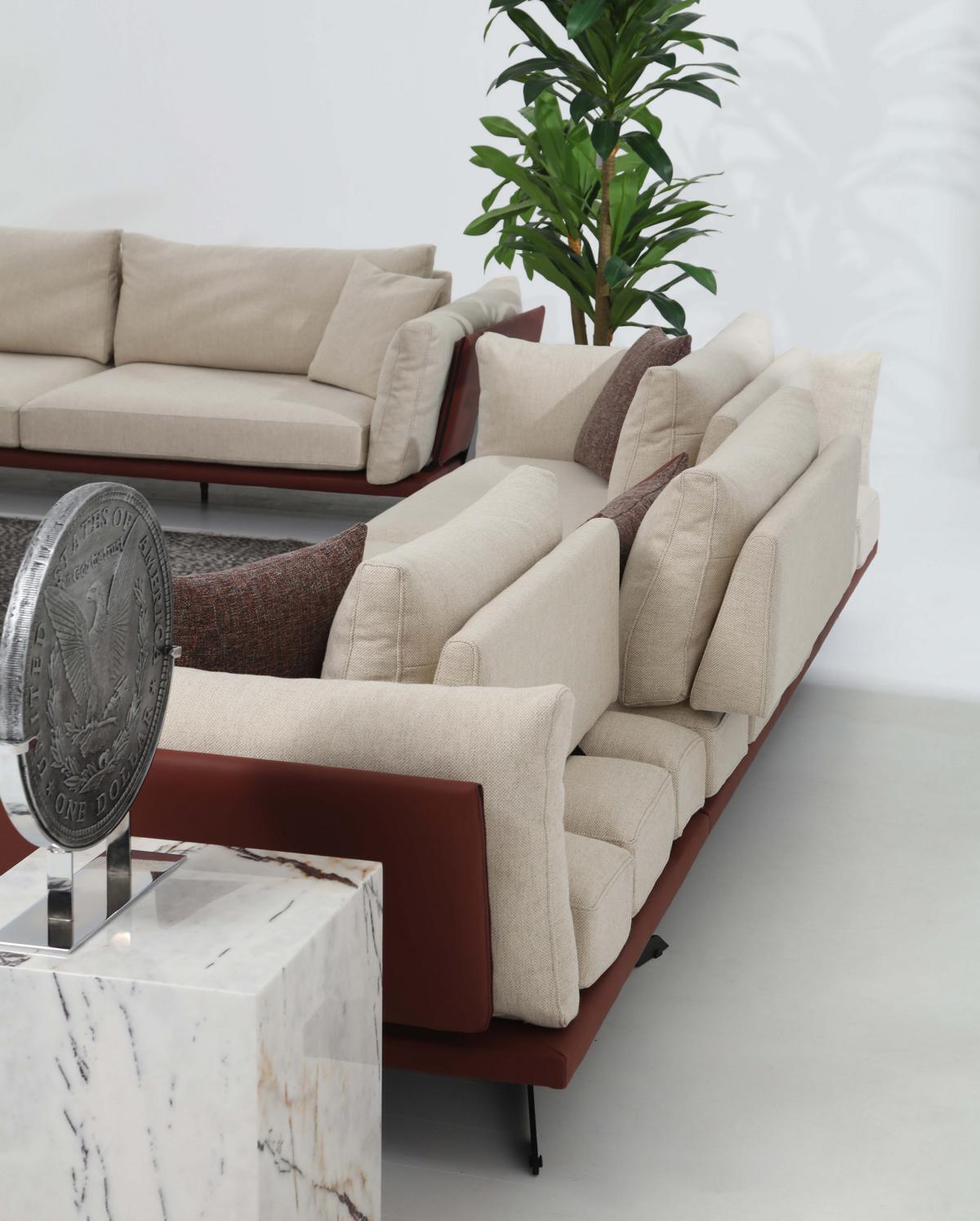 Sofas komplekts ar diviem sēdvietu stūra dīvānu L-formā, bēša krāsā, modernā audumā.