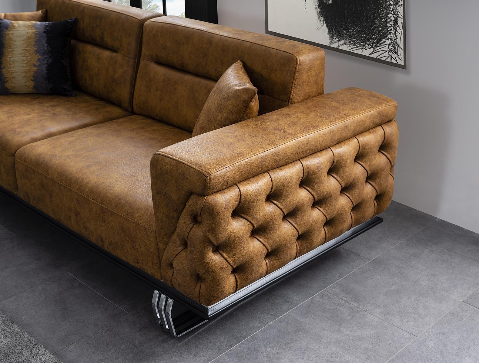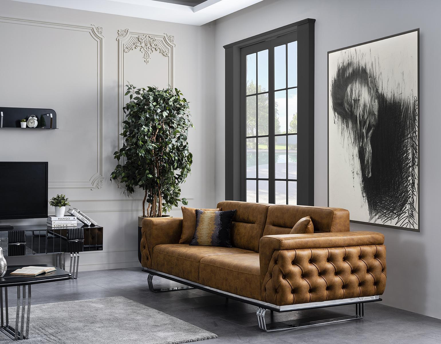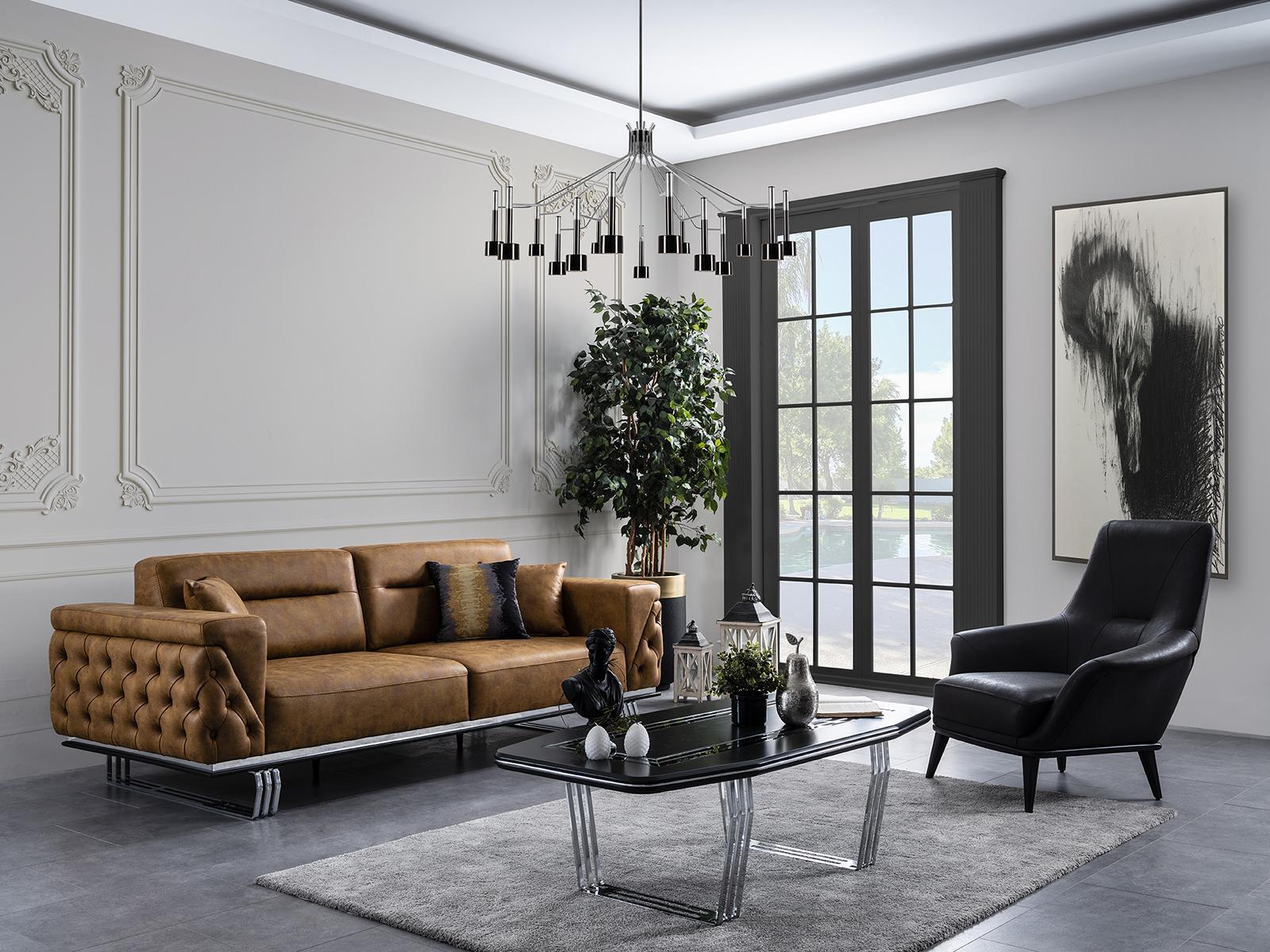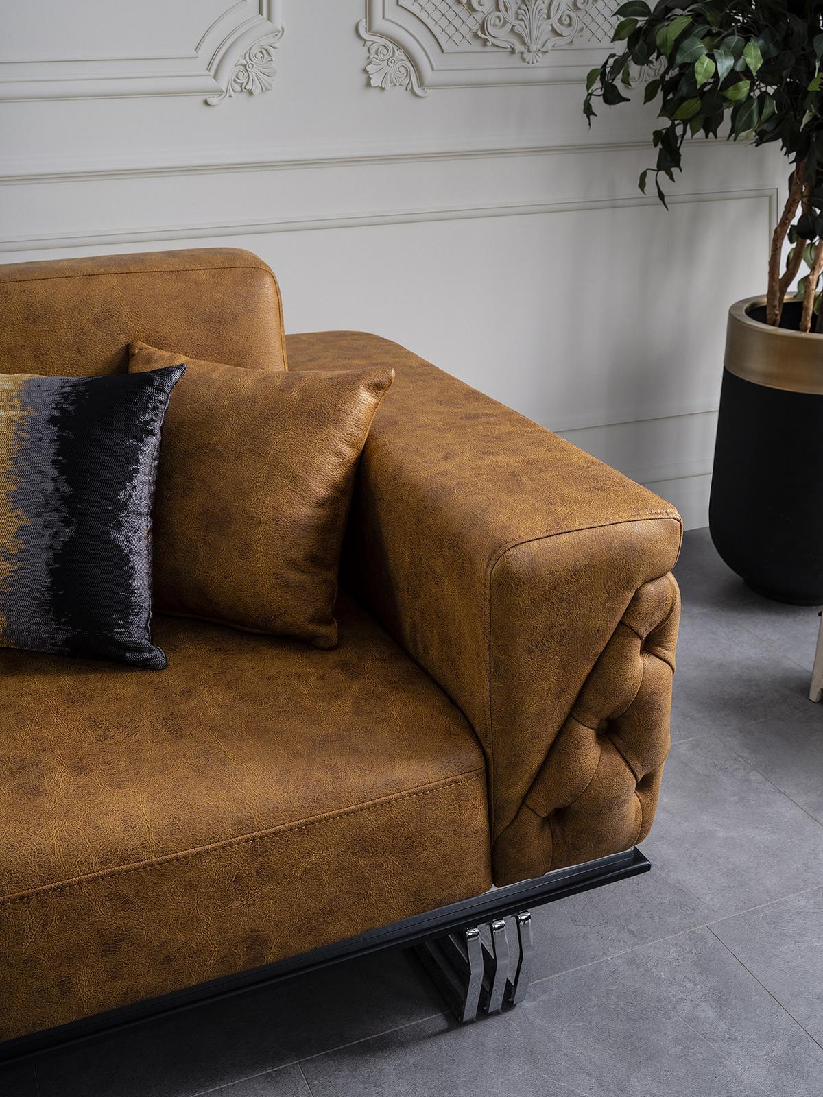 Pateicoties brūnajai krāsai, šis komplekts ideāli iederēsies dažādās interjera dizaina shēmās, piešķirot telpai siltumu un eleganci. Lielisks risinājums gan dzīvojamā istabā, gan viesu uzmundrināšanai, jo tajā varēs sēdēt ērti un relaksēties. Izmantojiet to, lai radītu mājīgu un stilīgu atmosfēru jūsu telpās, kur ģimene un draugi var baudīt kopā pavadīto laiku.