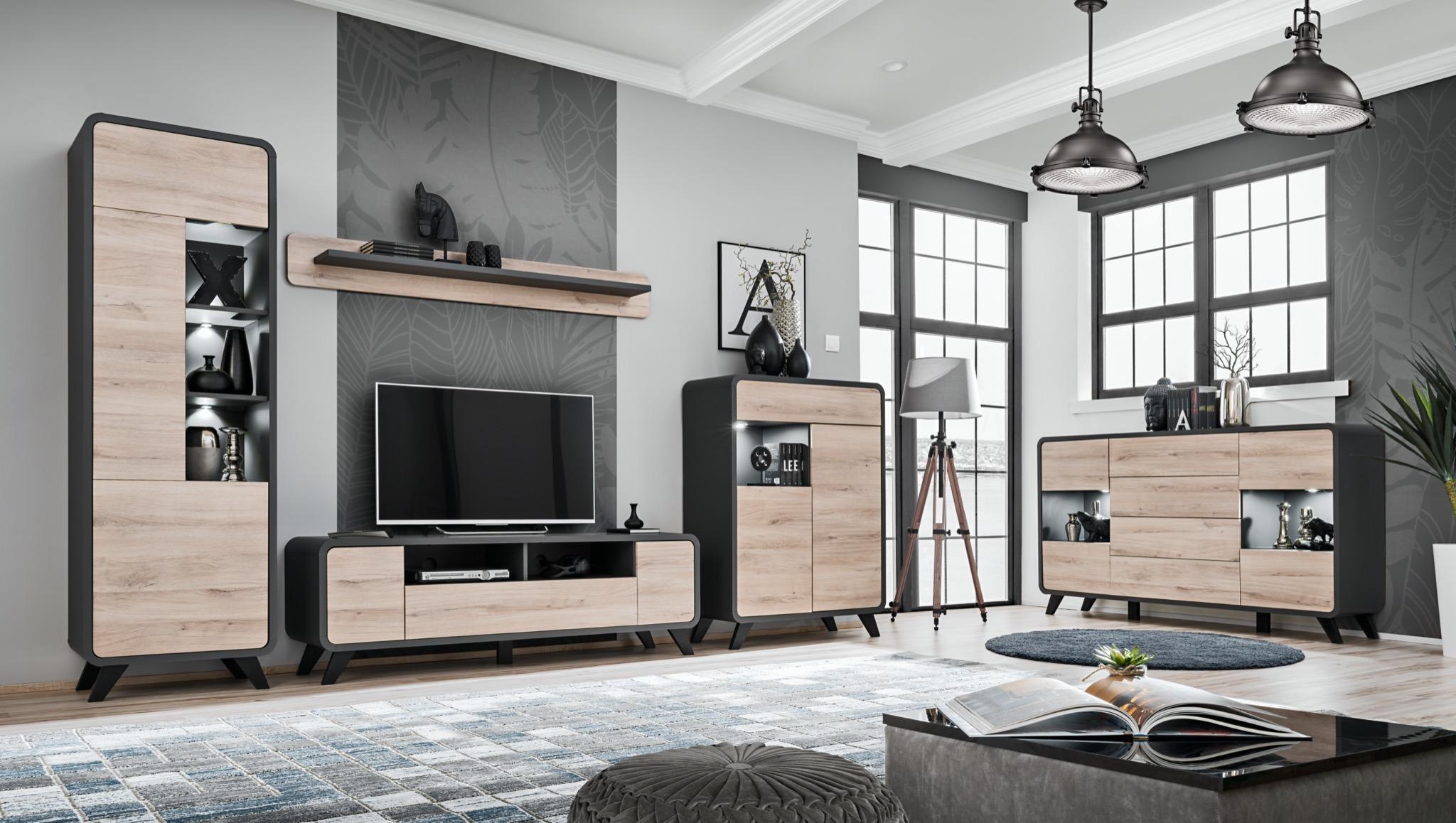 5 daļu viesistabas komplekts ar TV stendu, vitrīnu, plauktu, koka mēbelēm | xlmebeles.lv