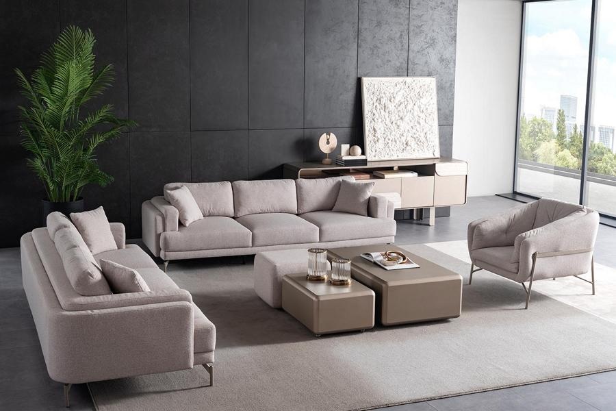 Beige auduma viesistabas komplekts ar modernu dīvānu un krēslu