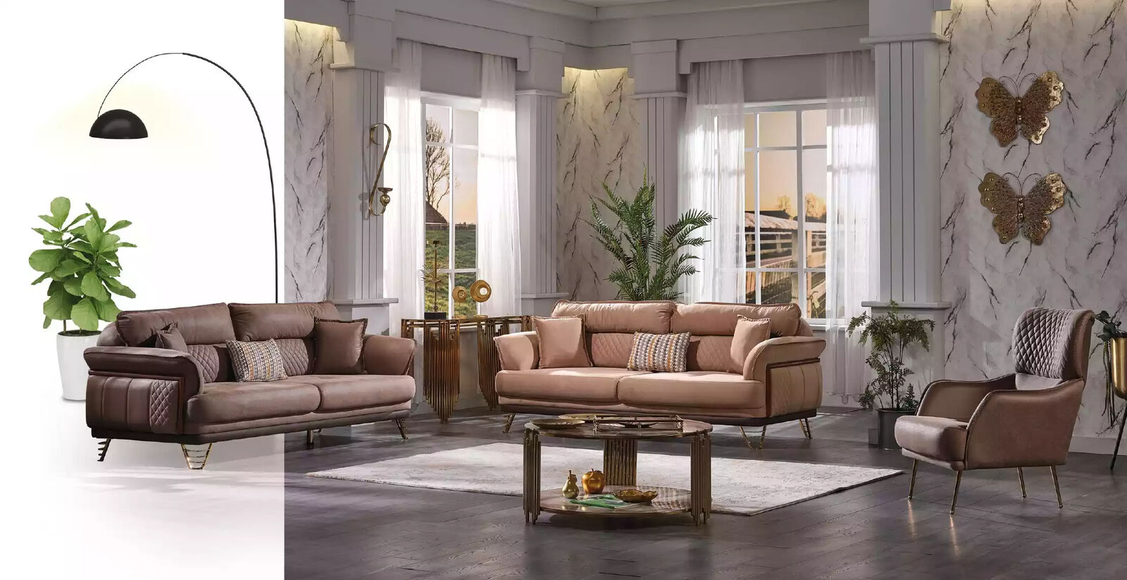Bruņa dīvānu komplekts ir ideāla izvēle, lai piešķirtu jūsu dzīvojamai telpai mājīgu un elegantu atmosfēru. Šis komplekts ir piemērots gan svinīgām pasākumu vakaram, gan arī ikdienas atpūtai ar ģimeni. Krāsa ir siltā brūnā tonī, kas piešķirs telpai mājīgumu un eleganci. Varat baudīt sava mājokļa jauno interjeru, atpūstoties uz šiem izcilajiem dīvāniem un krēsliem, kas piedāvā ne tikai stilu, bet arī komfortu un izturību ilgstošai lietošanai.