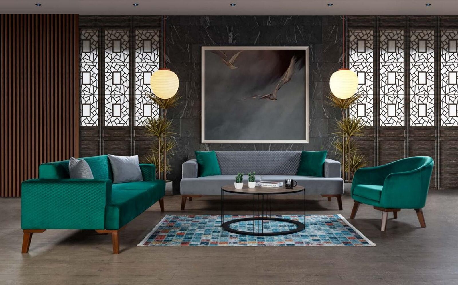 Šis pelēkā tumši zilā un zaļā krāsā dizainētais dzīvojamais stūris ne tikai piesaistīs skatienus ar savu moderno izskatu, bet arī nodrošinās ērtību un atpūtu. Izmantojot šo komplektu, jūs varēsiet baudīt relaksējošus mirkļus, skatoties TV vai lasot grāmatu. Materiāls ir viegli kopjams, nodrošinot ilgstošu produkta kalpošanas laiku un estētisko baudījumu. Šis sofas komplekts ir pieejams arī citās krāsās pēc jūsu pieprasījuma, tādējādi atbilstot jūsu individuālajiem vajadzībām un interjera stilam.