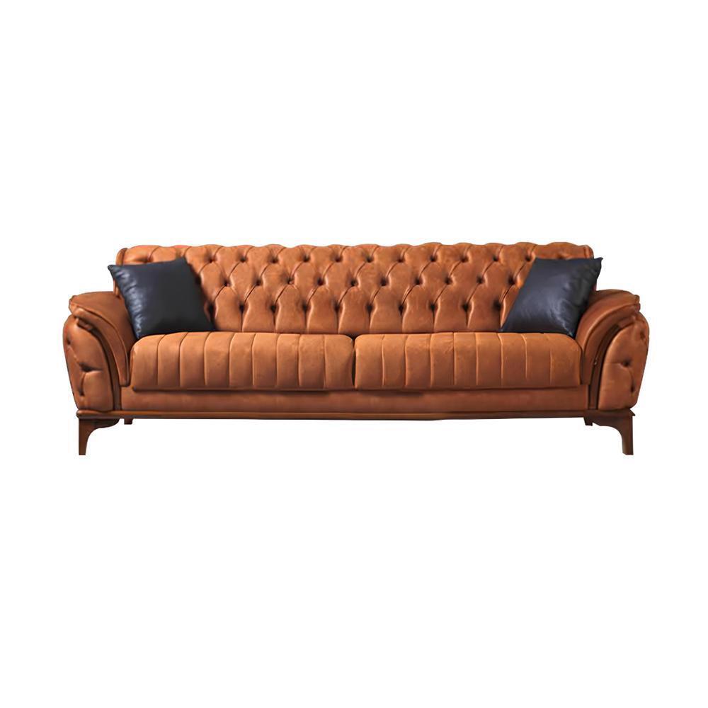 Ar šo **Balta-oranžo dzīvojamā istabas Chesterfield luksusa dīvāngarnitūru ar trīsdurvja dīvānu** iemiesosiet mēbeļu eleganci un komfortu savā dzīvojamā istabā. Šis dizaina šedevrs liek uzsvaru uz augstvērtīgu materiālu savienojumu, nodrošinot gan stilīgu izskatu, gan ērtu sēdēšanu. Ar izmēriem apmēram 240 x 90 x 80 cm šis dīvāns ir lielisks gan privātajām dzīvojamām istabām, gan viesu uzņemšanai.
