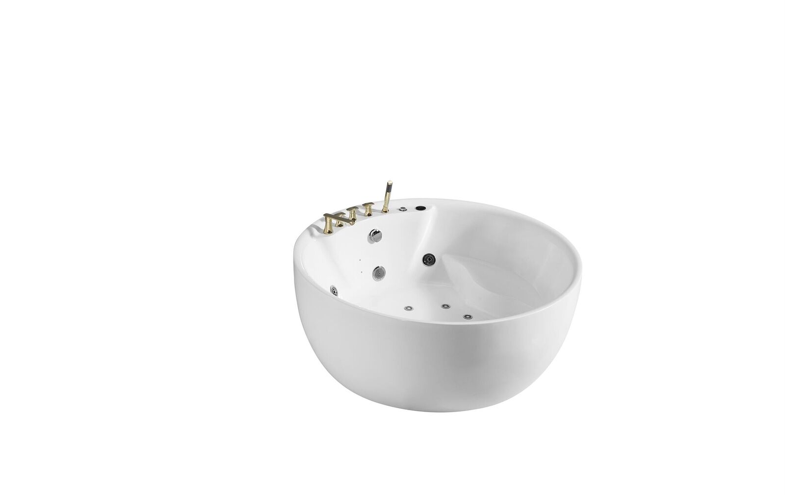 Apļveida vannas baseins burbuļvannas baseins Relaksējošais baseins Spa Balts 150cm, burbuļu masāžas dušas ir ideāla izvēle, lai pilnībā ietilpinātu savu relaksējošo baseina pieredzi. Ar tāmām masāžas strūklām, jaucējkrānu, rokas dušu, masāžas funkciju un citiem aprīkojuma elementiem, šis baseins nodrošina izcilu atpūtu un ērtības mājās. Pārplūdes aizsardzība un masāžas jaudas regulēšana jūsu rokasās, lai pielāgotu savu relaksācijas pieredzi individuāli.